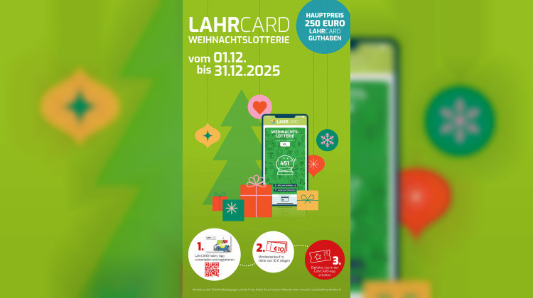 Vom 1. bis 31. Dezember 2025 läuft die LahrCARD-Weihnachtslotterie. Mit jedem Einkauf ab 10 Euro in teilnehmenden Geschäften erhältst du ein digitales Los in der LahrCARD-App.